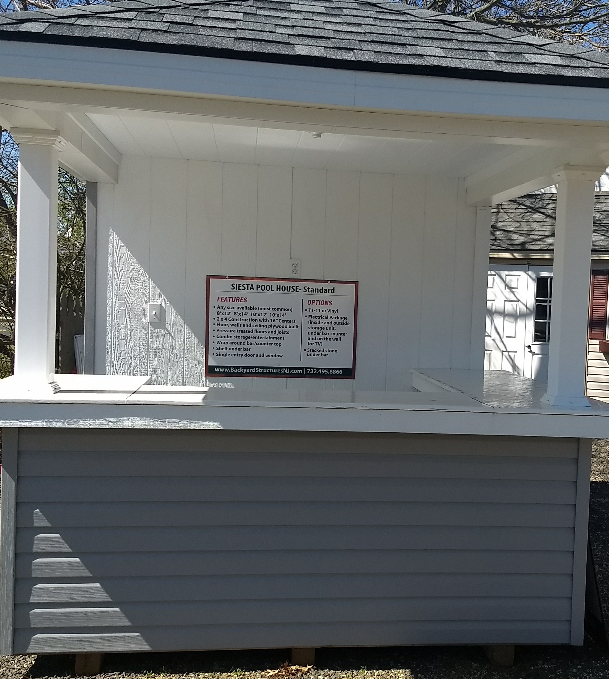 Visit our showroom in Belford, NJ to see our in-stock pool house or give us a call with your site measurements you’re looking for!
