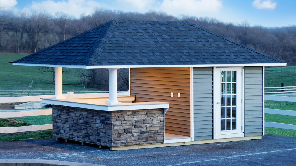 A perfect choice for residential or community pools, or other commercial applications. Amish construction featuring an A-frame roof (open or closed) and a built-in bar or serving counter.